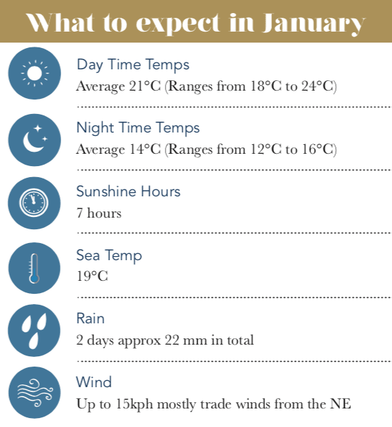 January skies usually bring plenty of sunshine and the promise of a bright New Year sees many winter sun seekers arriving on the island. As in December the evenings are cooler so be sure to have a fleece and maybe a pair of jeans ready for the night time.