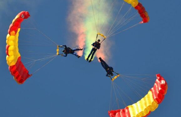 A Puma helicopter was exhibited before it took off and carried out a sea rescue simulation. This was followed by a skydive by nine paratroopers from the PAPEA (Acrobatic Parachute Patrol of the Spanish Air Force), who leapt from a C212 aircraft, unfolded a huge Canarian tricolour flag, and landed on the beach.