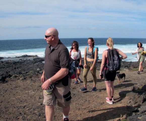 We park our cars opposite the main reception of Club La Santa and start walking south-west. Very quickly we arrive at the lovely wee beach of Playa Boca de Abajo, which is a black sand volcanic strand rarely visited by tourists. As we take a pleasant stroll along the beach I notice that we are alone: just me, five girls and Peanut the dog, and we can just hear the sound of the waves as Club La Santa still remains closed.