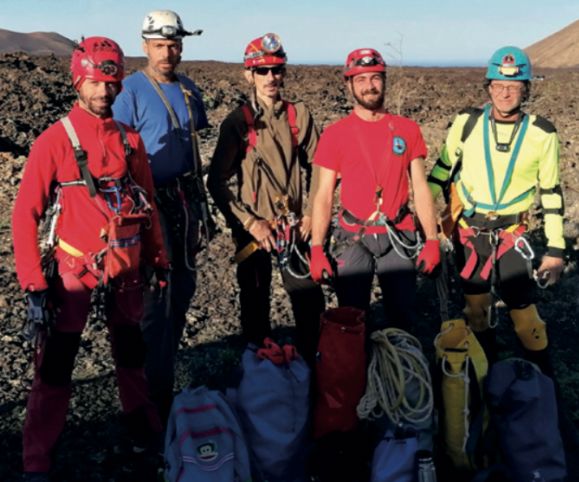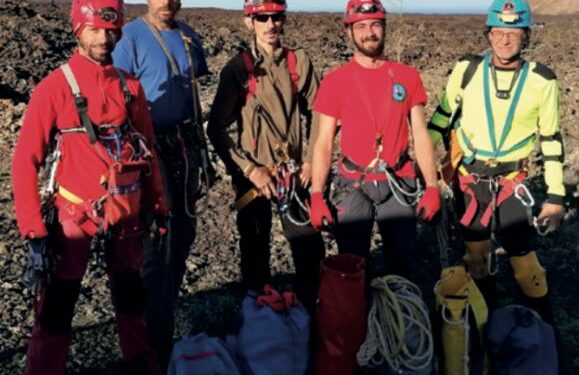 In late December 2019, a group of explorers from Lanzarote’s Vulcan Vertical club and Speleo Nederland took up their investigations again. Prospecting had already been done for some years and it was decided to install several hauling systems in the cave to deal with the tightness of the squeezes leading into the deep. Gaps and fissures of 23 – 25cm are quite common in this shaft system and were a real challenge to overcome. It’s a physically gruelling and mentally claustrophobic experience that is definitely not for the faint-hearted.