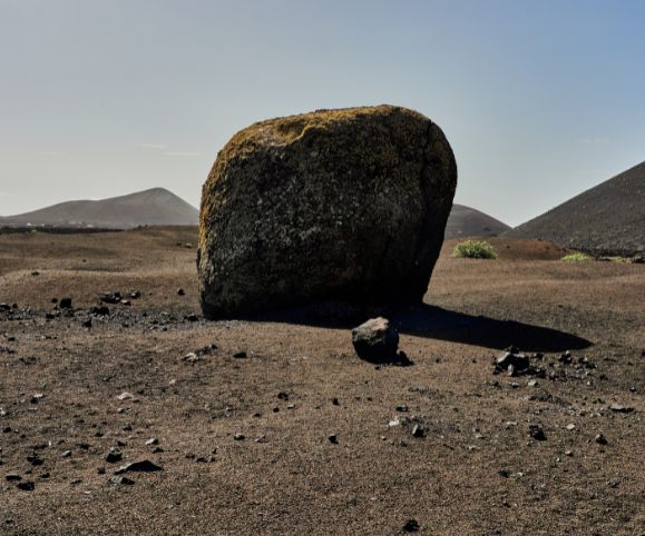 A volcanic bomb is any stone over 2.5 inches big that has been formed by lava flying out of a volcano. The globs of liquid lava often form rounded shapes in the air before solidifying and landing. Any walk in Timanfaya or the volcano regions surrounding it will reveal several bombs of different shapes, but very few of them reach a large size.