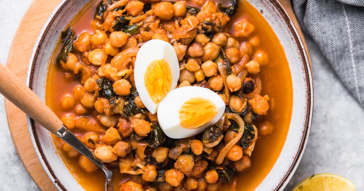 1. If using dried chickpeas, soak overnight then boil at a low simmer for an hour (20 minutes in a pressure cooker). Boil the eggs until hard, peel and set aside.