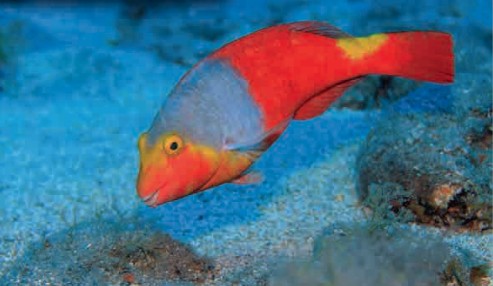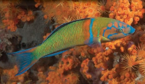 A large fish that is usually seen bustling quickly around rocks and using it’s tough beak and lips to finds bits of food. Females are a brightly coloured red, grey and yellow, while males are a duller green.