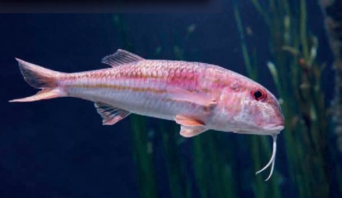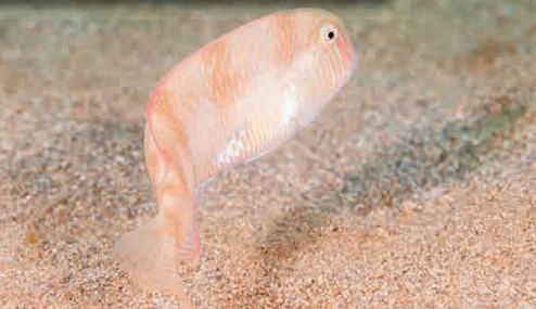 This mullet is pink, but as red light doesn’t penetrate far under water they usually look grey. Usually seen on sandy seabeds using their beard-like barbels to sense food, which they then snort up and filter. They’re usually seen in small groups of two to five.