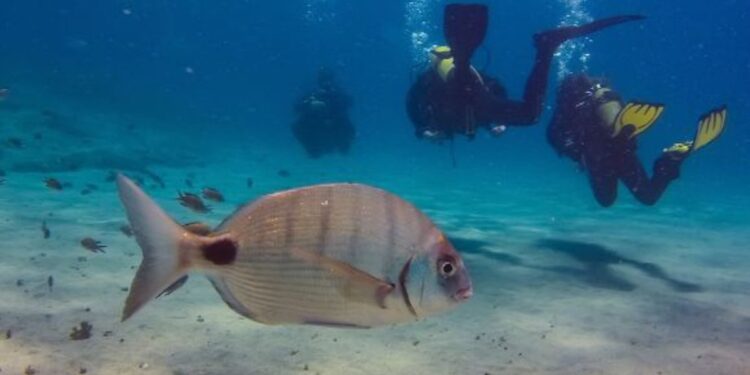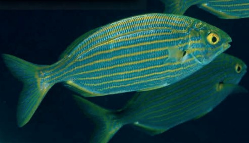 One of several sea bream found around the island, this one stands out for golden stripes on silver background, and its habit of forming large shoals, which graze on rocks like herds of cattle or swirl around over sandy seabeds.