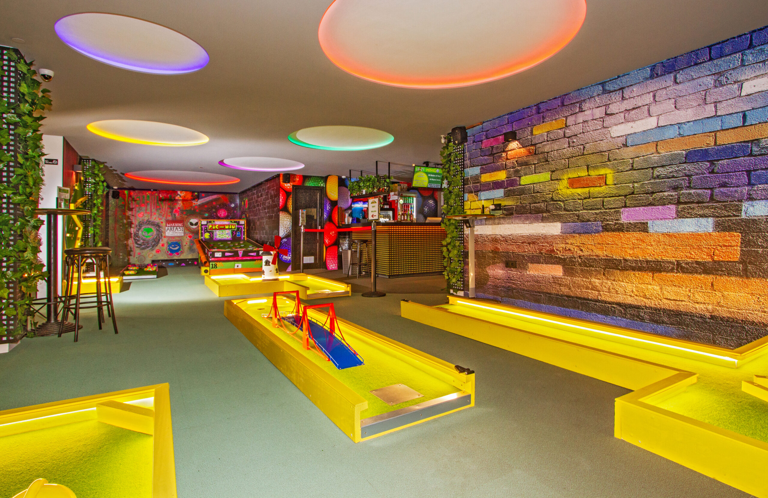 This changes at night, when the course takes on a neon vibe with glow in the dark painted walls and led-lit holes.
