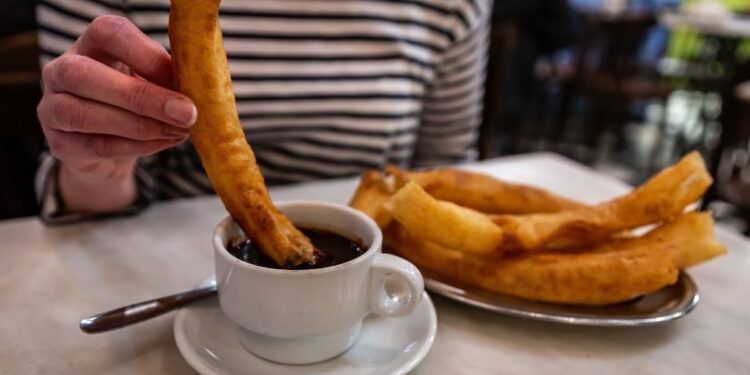 In bars and cafés, churros are usually prepared and served in the morning and the traditional way to eat them is dipped into a cup of gloopy hot chocolate. However, many simply empty a sachet of sugar on their plate and dip the churros in this. You’ll also see churro stalls at fairs and markets.