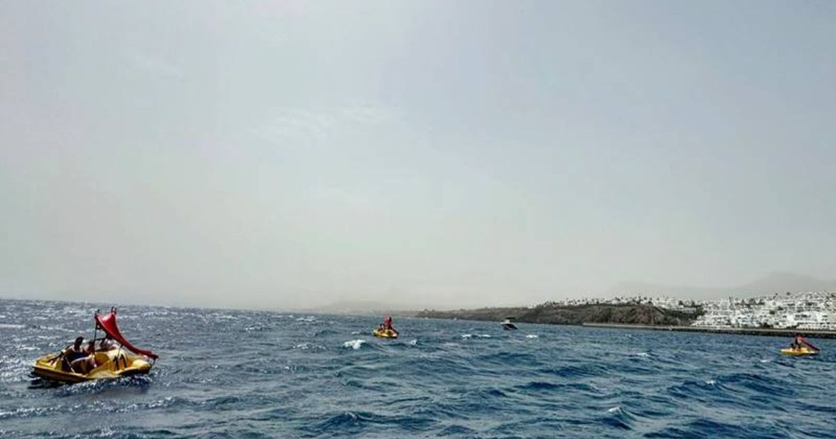 Lifesavers from the Lanzarote Rescue and Emergency Service had to use an inflatable launch to rescue the holidaymakers, who were on three pedalos which had been caught up in sudden strong winds and been blown out to sea half a mile from the Hotel Fariones.